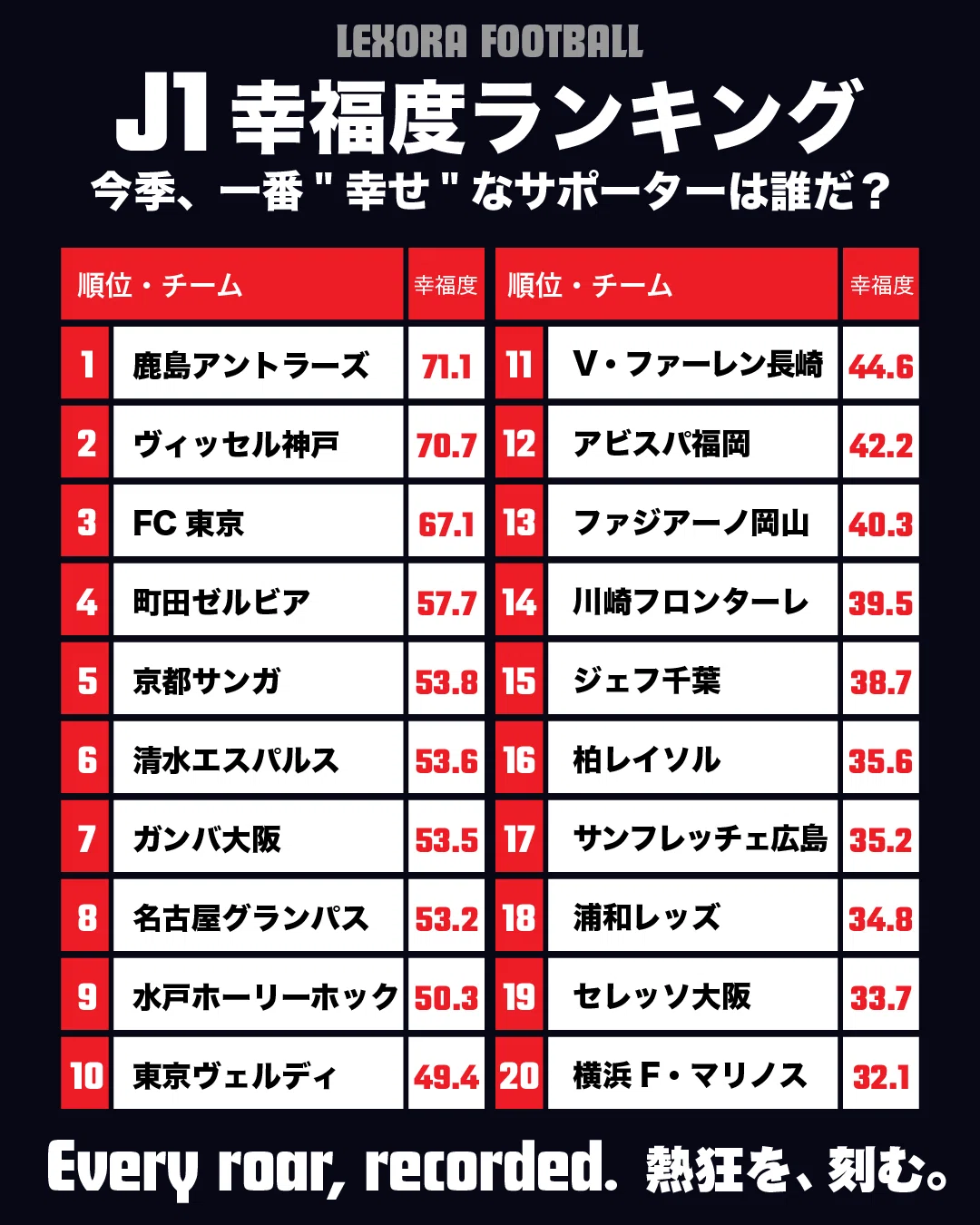 1st 🥇 Kashima Antlers ― Happiness Score 71.1